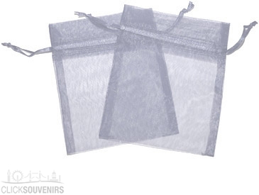 Silver organza gift bag with draw string. Size: 9 x 7 cm. These voile bags are ideal for small novelty items including keyrings, magnets, jewellery and wedding favours. One Supplied.
